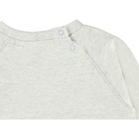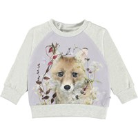 Elsa er en lysegrå babybluse med front print af en ræv. Elsa har raglanærmer og trykknap i nakken, der gør det nemt at få blusen af og på.