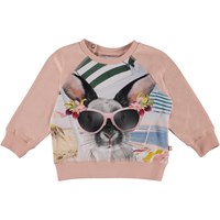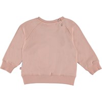 Langærmet, sweat look baby bluse i rosa med raglanærmer og placement print på fronten. Blusen har rib ved hals, ærmeafslutning og bund. Åbnes og lukkes let med trykknapper ved halsen.