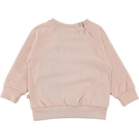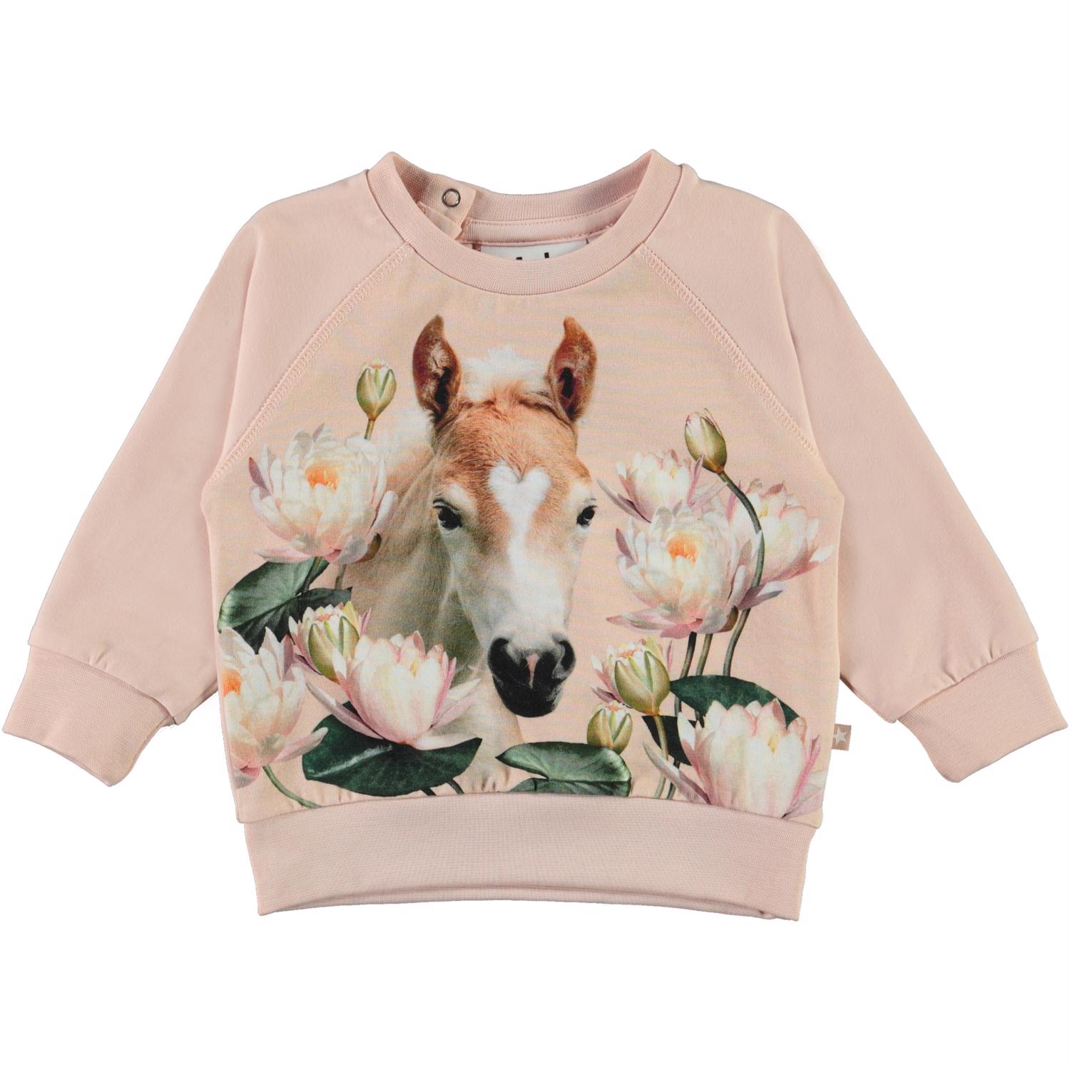 Elsa er en lyserød babybluse med front print af et føl mellem lyserøde åkander. Elsa har raglanærmer og trykknap i nakken, der gør det nemt at få blusen af og på.