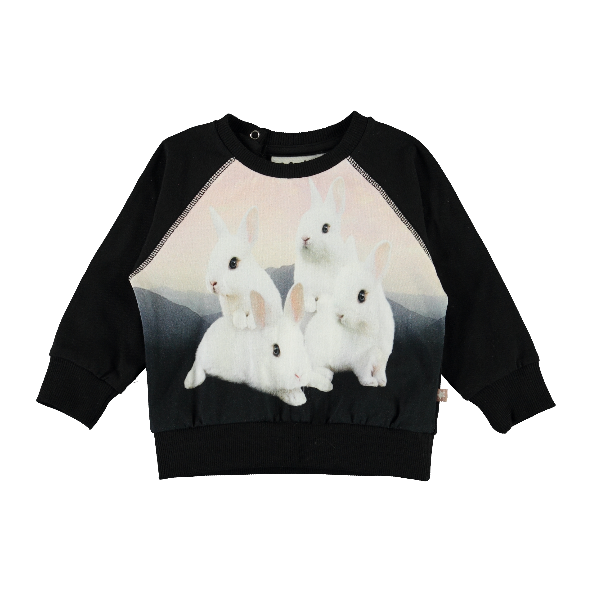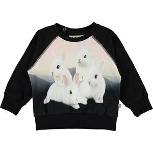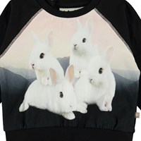 Elsa er en sort baby bluse med print af søde kanin unger på fronten. Elsa har raglanærmer og trykknap i nakken, som gør det nem at få blusen af og på.