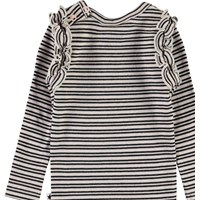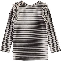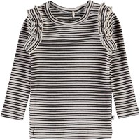 Emma er en baby bluse i rib og med striber i farverne sort og beige. Blusen har flæsekant rundt i ærmegabene, samt knappelukning i nakken.