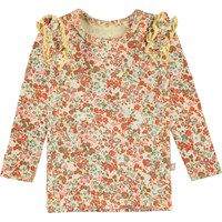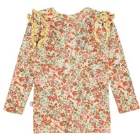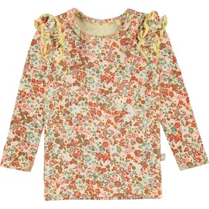 Emma er en babybluse med flæser i fint småblomstret print. Blusen har lange ærmer med flæser ved ærmegabet og trykknap på den ene skulder. Certificeret af Ecocert Greenlife, certifikationsnummer. 197496.