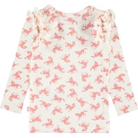 Emma er en hvid babybluse med flæser og lyserødt hesteprint. Blusen har lange ærmer med flæser ved ærmegabet og trykknap på den ene skulder. Certificeret af Ecocert Greenlife, certifikationsnummer 197496.