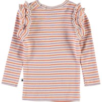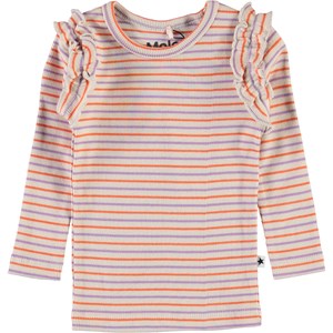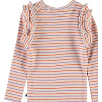 Emma er en baby bluse i rib og med striber i farverne beige, lilla og orange. Blusen har flæsekant rundt i ærmegabene, samt knappelukning i nakken.