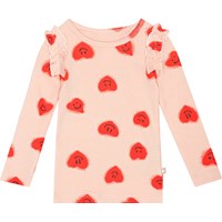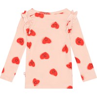 "Lyserød bluse med lange ærmer i blødt økologisk bomuldsjersey. Blusener tætsiddende, har rund hals og en flæsekant rundt i ærmegabet. Blusen har et alloverprint af søde graffiti hjerter med smilende ansigter.