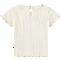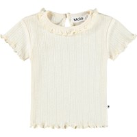 Hvid t-shirt til de mindste i økologisk bomulds-pointelle, med tæt pasform og dekorative babylock-kanter. Blød og åndbar – perfekt som inderste lag.