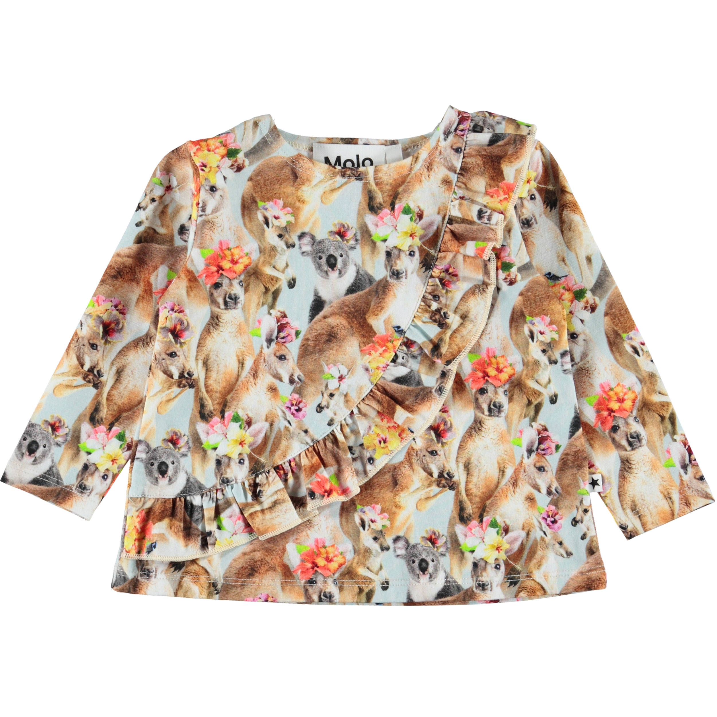 Evelyn er en baby bluse med all-over print af kænguruer med blomster på hovedet. Blusen har lange ærmer og en skrå flæsekant over fronten på blusen.