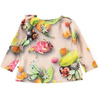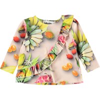 Evelyn er en baby bluse i lyserød med all-over print af tropiske frugter. Blusen har lange ærmer og en skrå flæsekant over fronten på blusen.
