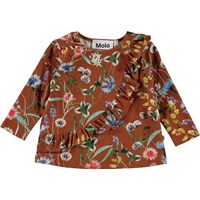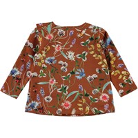 Evelyn er en baby bluse i brun med print af vilde blomster. Blusen har lange ærmer og en skrå flæsekant over fronten på blusen.