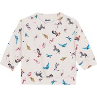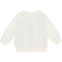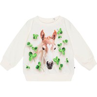 Råhvid sweater til de mindste i økologisk bomuldsjersey. Sweateren har ribkant ved hofte og ærmer samt en rund halsudskæring med to trykknapper i nakken der gør den er nem at få af og på. Sweateren har et sødt frontprint af en smuk hest med kløver rundt om sig.