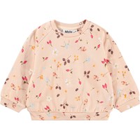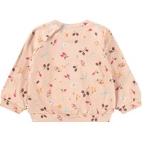 Blød sweatshirt til de mindste i økologisk bomuld. Den er rosa med print af nødder, blomster og bær. Sweatshirten har raglanærmer, ribkanter og en rund halsudskæring med knaplukning bag skulderen, hvilket gør den nem at tage af og på.