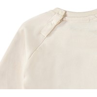 Blød cremefarvet sweatshirt til de mindste i økologisk bomuld. Sweatshirten har raglanærmer, ribkanter og en rund halsudskæring med knaplukning bag skulderen, hvilket gør den nem at få af og på. Denne style har en ubørstet inderside, hvilket gør den dejlig kølig på en varm dag. Denne sweatshirt har et grønt printet smilede hjerte på fronten. Kombinér med de matchende bukser for et komplet outfit.
