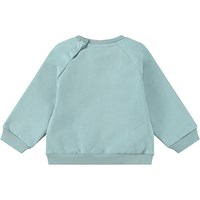 Lyseblå sweatshirt til de mindste i økologisk bomuldsjersey med en børstet inderside, der gør den dejligt blød og varm at have på. Sweatshirten har raglanærmer, ribkant ved hofte og ærmer samt en rund halsudskæring med to trykknapper i nakken, hvilket gør den nem at få af og på. På fronten af sweatshirten er der et placeret print med to søde kattekillinger, der leger med blomster.