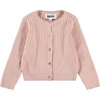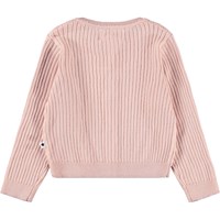 Lyserød cardigan i ribstrikket, økologisk bomuld til de mindste. Har ribkanter og lukkes med små perlemorsknapper foran.