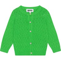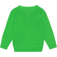 Strikket grøn cardigan til de mindste i økologisk bomuld. Cardiganen er i en fin mønstret strik med ribkanter i ærmerne, hals samt ved hoften. På fronten lukkes cardiganen med små perlemorsknapper.
