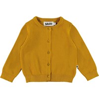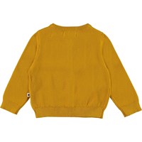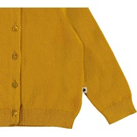 Ginny er en langærmet, strikket gylden cardigan. Ginny har knapper ned langs fronten, samt rib ved hals, ærmeafslutning og bund.