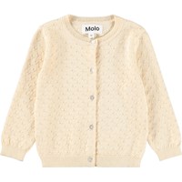 Råhvid strikcardigan til de mindste, fremstillet i økologisk bomuld. Cardiganen er strikket i et blomstermønster, har rund halsudskæring, ribkanter og perlemors knapper ned langs fronten.