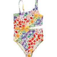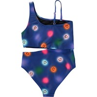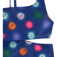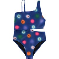 Badedragt i genanvendt polyester med UV-beskyttelse 50+. Badedragten har en almindelig pasform, indsnit i siden, er helforet og har en asymmetrisk bred strop samt en tynd justerbar strop, der sikrer en god pasform. Badedragten er blå med et allover-print af farverige, smilende prikker. Produktet er CE-mærket og testet i henhold til standard: EN-13758-1.