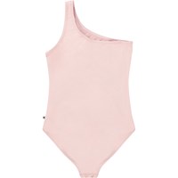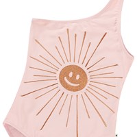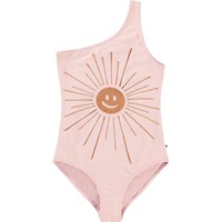 One-shoulder badedragt i genanvendt polyester med UV-beskyttelse 50+. Badedragten har en almindelig pasform, asymmetrisk bred strop og er helforet. Den er lyserød med et smilende solbroderi i guld. Produktet er CE-mærket og testet i henhold til standard: EN-13758-1.