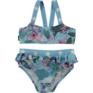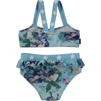 Fin bikini med digitalprintede fugle, flæsedetaljer på trusserne samt matchende blå taljebånd og stropper med printede Molo stjerner. Stropperne er fæstnet midt på ryggen og stoffets elasticitet giver god bevægelighed. Dette produkt har UV-beskyttelse 50+ og er blevet testet adskillelige gange både før, under og efter brug.