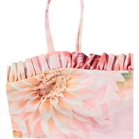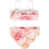 Strækbar bikini til aktive børn, fremstillet af genanvendt polyester med UV-beskyttelse 50+. Bikiniens overdel er bred med flæsedetaljer, smalle stropper og er helforet. Underdelen har elastik med flæsekant i taljen, almindelig pasform og er også helforet. Bikinien er lyserød med et allover-print af blomster i lyse og lyserøde nuancer. Produktet er CE-mærket og testet i henhold til standard: EN-13758-1.