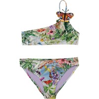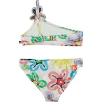 Asymmetrisk bikini i lyse farver med et smukt sommerprint af hæklet blomster. Bikinien har en enkelt skulderstrop, med broderiapplikation af en blomst i matchende farver. Bikinien er fremstillet i genanvendt polyester og har høj UV-beskyttelse 50+. Produktet er CE-mærket og testet i henhold til standard: EN-13758-1.