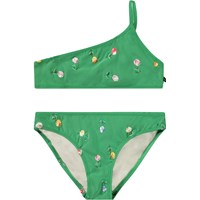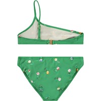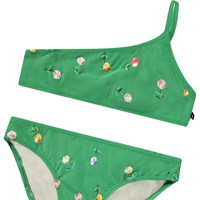 Asymmetrisk bikini i genanvendt polyester med UV-beskyttelse 50+. Bikinien har en bred overdel, en enkel, smal og justerbar skulderstrop, dyb ryg med spændelukning og er helforet. Underdelen har elastik i taljen, en almindelig pasform og er helforet. Bikinien er grøn med små broderede sommerblomster. Produktet er CE-mærket og testet i henhold til standard: EN-13758-1.