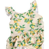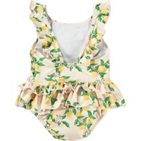 Badedragt i gul med citrusprint til de mindste. Fremstillet i genanvendt polyester med UV-beskyttelse 50+. Badedragten har dekorative flæsedetaljer, dyb ryg, elastik omkring lårene og en foret underdel med plads til en ble.