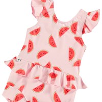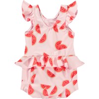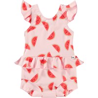 Lækagefri badedragt til de mindste i genanvendt polyester med UV-beskyttelse 50+. Badedragten er helforet og har fine detaljer. Underdelen er helforet og har en tætsiddende pasform, der slutter tæt om lår og mave, hvilket gør, at den kan bæres uden badeble. Badedragten er lyserød med solmodne vandmelonstykker. Produktet er CE-mærket og testet i henhold til standard: EN-13758-1.