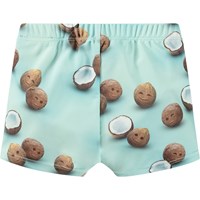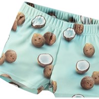 Badebukser til de mindste i genanvendt polyester med UV-beskyttelse 50+. Badebukserne har en almindelig pasform, indershorts med plads til en ble, elastik og indvendig snøre i taljen, som gør dem behagelige at have på. Badebukserne er lyseblå med et allover-print af friske kokosnødder. Produktet er CE-mærket og testet i henhold til standard: EN-13758-1.