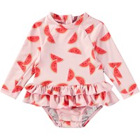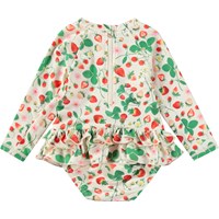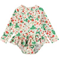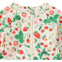 Badedragt til de mindste i genanvendt polyester med UV-beskyttelse 50+. Badedragten har lynlås i ryggen og knapper i kilen, hvilket gør det nemt at skifte ble. Den har elastik omkring lårene, en foret underdel med plads til en ble samt lange raglanærmer, der beskytter mod solens stråler. Badedragten er hvid med et allover-print af friske jordbærplanter. Produktet er CE-mærket og testet i henhold til standard: EN-13758-1.