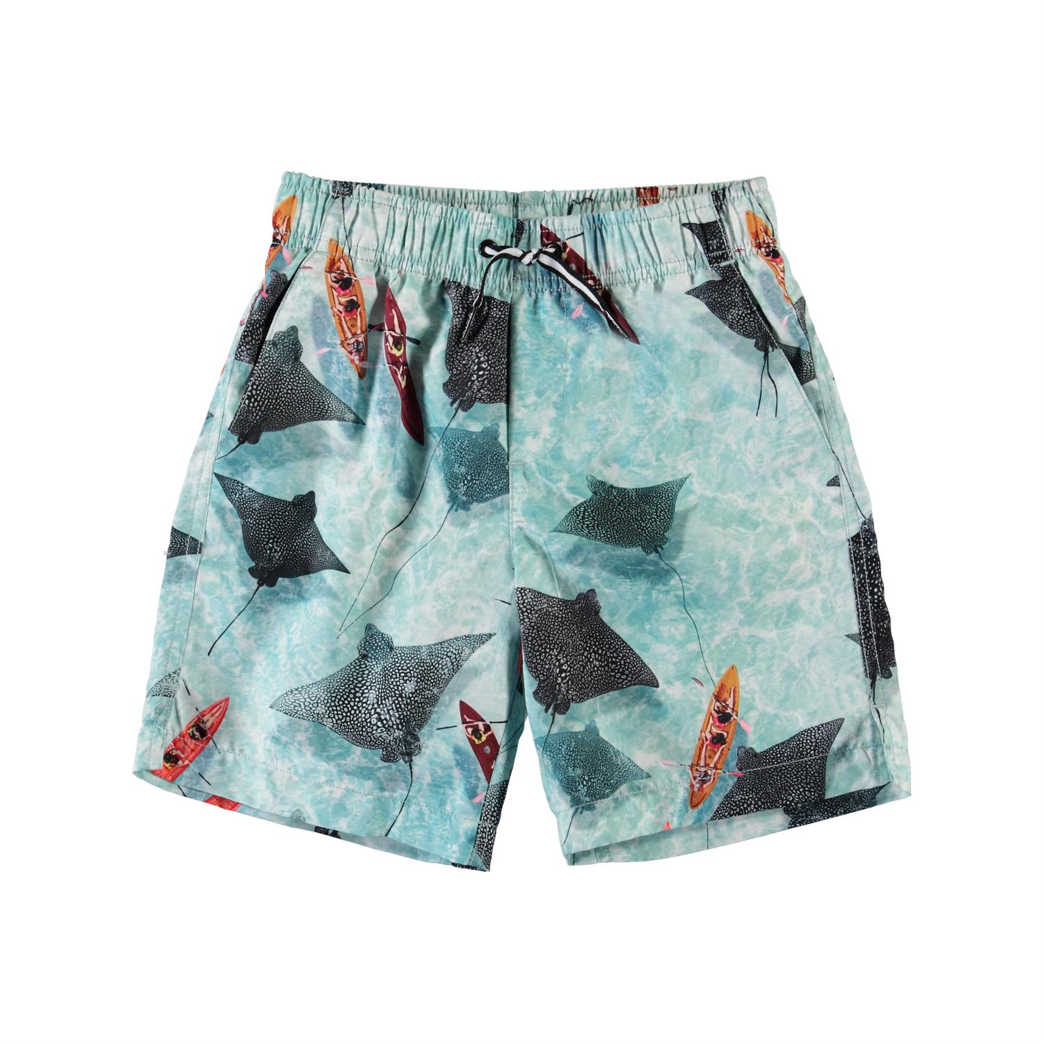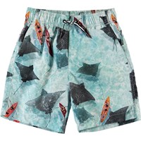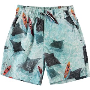 Nario er et par badeshorts med god længde, elastisk talje med bindebånd, samt lommer i siden. Her er Nario i lyseblå med print af rokker. Kombiner badeshortsene med en matchende t-shirt. Molo's badetøj har UV beskyttelse 50+. Produktet er CE-mærket og testet i henhold til standard: EN-13758-1.
