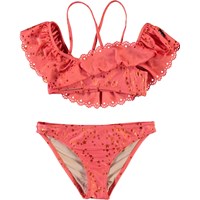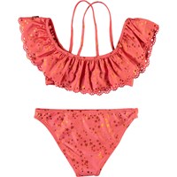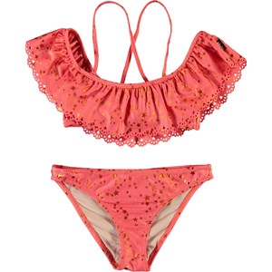 Natacha er en koral rød bikini med gyldne stjerner. Bikini overdelen har en flot broderie anglaise kant, samt krydsede stropper på ryggen. Bikini overdelen kan både bruges off-shoulder og oppe på skuldrene. Molo's badetøj har UV beskyttelse 50+. Produktet er CE-mærket og testet i henhold til standard: EN-13758-1.