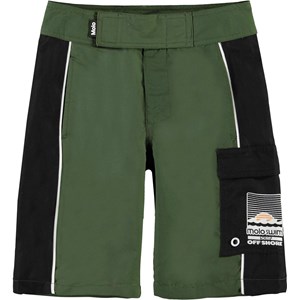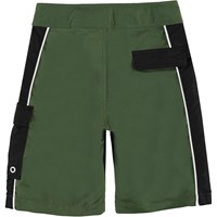 Natan er Molo's badeshorts med mere længde og en løs pasform, samt lomme på det ene ben. Her er Natan i grøn og sort, med hvide detaljer og hvidt gummiprint på lommen. Molo's badetøj har UV beskyttelse 50+. Produktet er CE-mærket og testet i henhold til standard: EN-13758-1.