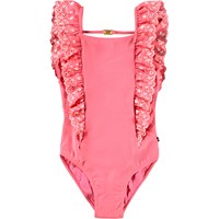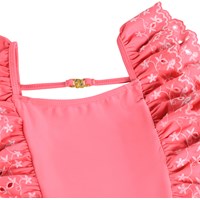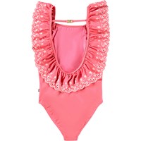 Pink, strækbar badedragt med lyserøde broderidetaljer i genanvendt polyester med UV-beskyttelse 50+. Modellen har almindelig pasform, er helforet og har flæser foran, som fortsætter over skuldrene og om til den dybe ryg. En smal strop med spænde i ryggen giver ekstra støtte og sikrer god pasform.