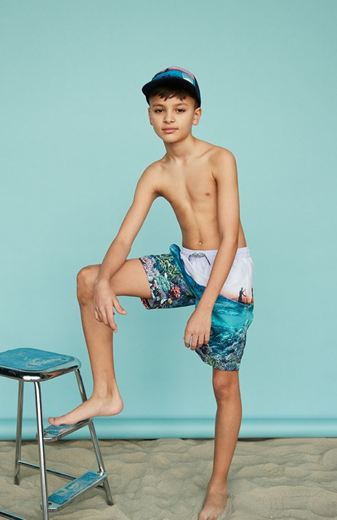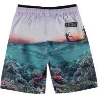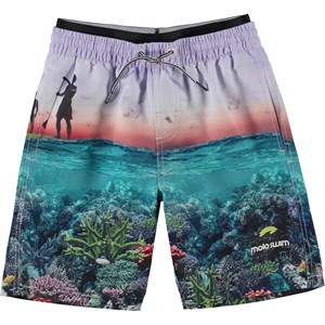 Neal er et par badeshorts med print af en på paddleboard og havet set ned fra bunden af hvor der er flotte koraler at spotte. Badeshortsene har en god længde og løs pasform. Neal har en elastisk lining med printet logo, som giver en cool detalje. Molo's badetøj har UV beskyttelse 50+.
