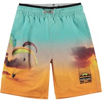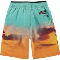 Neal er et par badeshorts, hvor farven fader fra tyrkis i toppen til orange i bunden og har print af faldskærmsudspringere. Badeshortsene har en god længde og løs pasform. Neal har en elastisk lining med printet logo, som giver en cool detalje. Molo's badetøj har UV beskyttelse 50+.