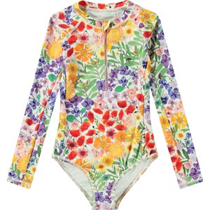 Badedragt til aktive børn i genanvendt polyester med UV-beskyttelse 50+. Badedragten har en tætsiddende pasform, opstående krave, lynlåslukning foran og lange raglanærmer, der giver ekstra beskyttelse mod solens stråler. Badedragten er hvid med et allover print af farverige pressede blomster. Produktet er CE-mærket og testet i henhold til standard: EN-13758-1.