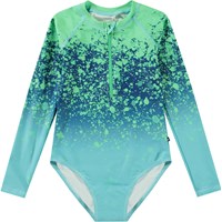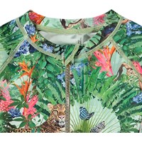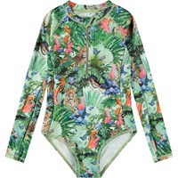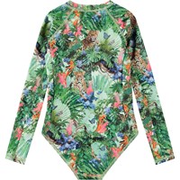 Badedragt til aktive børn i genanvendt polyester med UV-beskyttelse 50+. Badedragten har en tætsiddende pasform, opstående krave, lynlåslukning foran og lange raglanærmer, der giver ekstra beskyttelse mod solens stråler. Badedragten er grøn med et farverigt jungleprint. Produktet er CE-mærket og testet i henhold til standard: EN-13758-1.