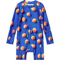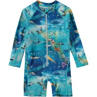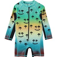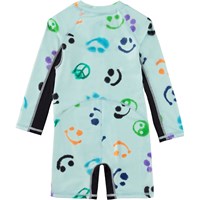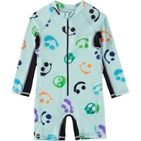Lyseblå svømmedragt med alloverprint af akvarelmalede emojis, peacetegn og yin og yang symboler i forskellige farver. Dragten har lynlås langs hele fronten samt lange ærmer og og korte ben, der giver god solbeskyttelse på udsatte områder. Den er fremstillet af genanvendt, elastisk polyester, hvilket gør den yderst behagelig og nem at få af og på. Den yder høj UV-beskyttelse på 50+, der effektivt beskytter mod solens stråler. . Produktet er CE-mærket og testet i henhold til standard: EN-13758-1.