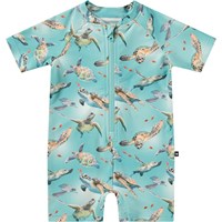 Badedragt med korte ærmer og ben til de mindste, lavet af genanvendt polyester og med UV-beskyttelse 50+. Badedragten har en lynlås foran, hvilket gør den nem at tage af og på. Den har en opretstående krave og god plads til en ble. Dragten er beige med et allover-print af farverige, smilende ansigter. Produktet er CE-mærket og testet i henhold til standard: EN-13758-1.