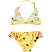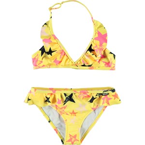 Nele er en halterneck bilkini i gul med stjerne print. Bikinien har flæsekant på både top og bund. Molo's badetøj har UV beskyttelse 50+. Produktet er CE-mærket og testet i henhold til standard: EN-13758-1.