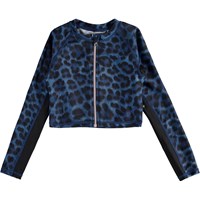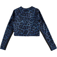 Nellie er en cool UV svømmebluse med lange ærmer og lynlås på fronten. Nellie har et sporty udtryk og med dens dækkende silhuet har den god beskyttelse mod solens stråler, da alt Molo's badetøj har UV 50+. Her er Nellie med print af blå jaguarpels. Blusen er tynd og rar at have på og har en god bevægelighed. Mix og match t-shirten med Molo's badeshorts for et cool surferlook. Produktet er CE-mærket og testet i henhold til standard: EN-13758-1.