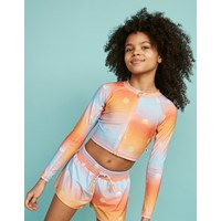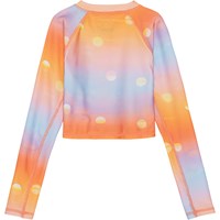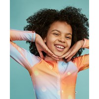 Nellie er en cool og sporty svømmebluse i orange og lyseblå med print af små sole. Blusen har lange ærmer og lynlås på fronten. Molo's badetøj har UV 50+. Produktet er CE-mærket og testet i henhold til standard: EN-13758-1.
