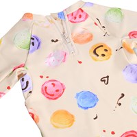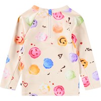 Cremefarvet badebluse med isprint til de mindste, fremstillet i genanvendt polyester med UV-beskyttelse 50+. Blusen har en tætsiddende pasform, opstående krave, lynlåslukning i ryggen, samt lange raglanærmer, der beskytter mod solens stråler.