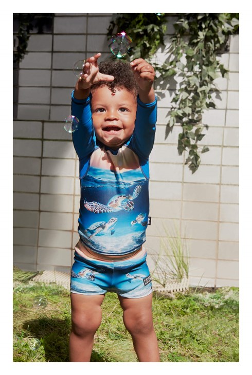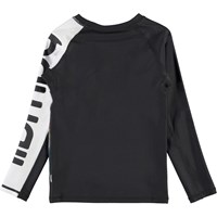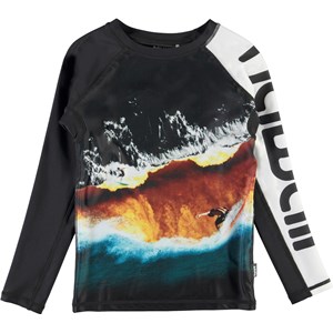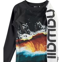 Neptune LS er en suveræn UV svømme t-shirt i sort med teksten 'Hawaii' på det ene ærme, samt print af store bølget og surfer på fronten. T-shirten beskytter mod solens skadelige stråler. T-shirten er tynd og rar at have på og har en god bevægelighed. Kombiner t-shirten med de matchende shorts for et cool surfer look. Molo's badetøj har UV beskyttelse 50+. Produktet er CE-mærket og testet i henhold til standard: EN-13758-1.