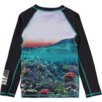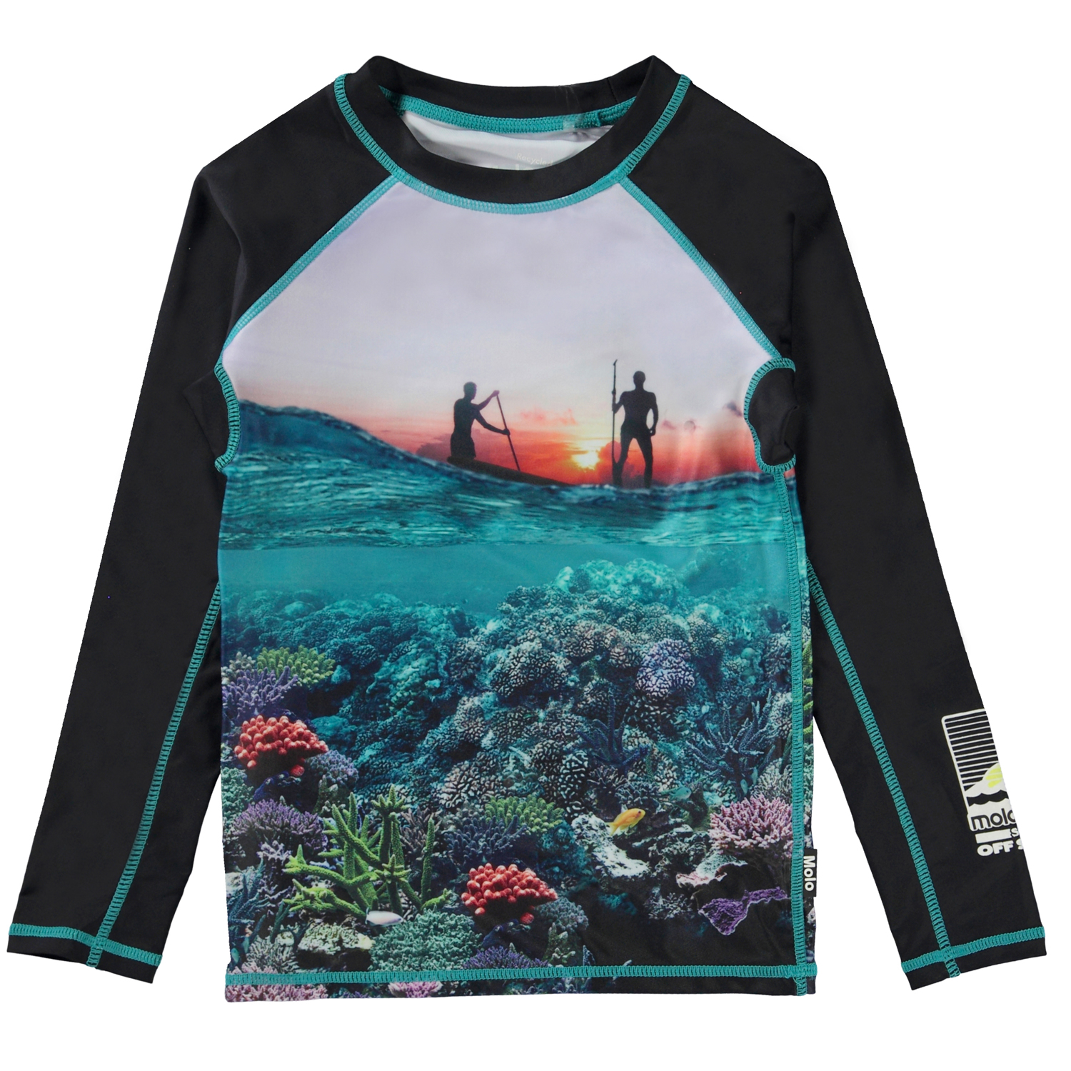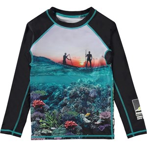 Neptune er en UV svømme t-shirt i sort med print af to personer på paddleboard set fra havets bund. T-shirten er tynd og rar at have på og har en god bevægelighed. Kombiner t-shirten med matchende shorts for et cool surferlook. Molo's badetøj har UV beskyttelse 50+. Produktet er CE-mærket og testet i henhold til standard: EN-13758-1.