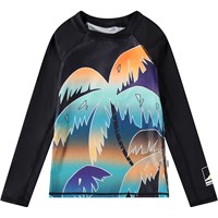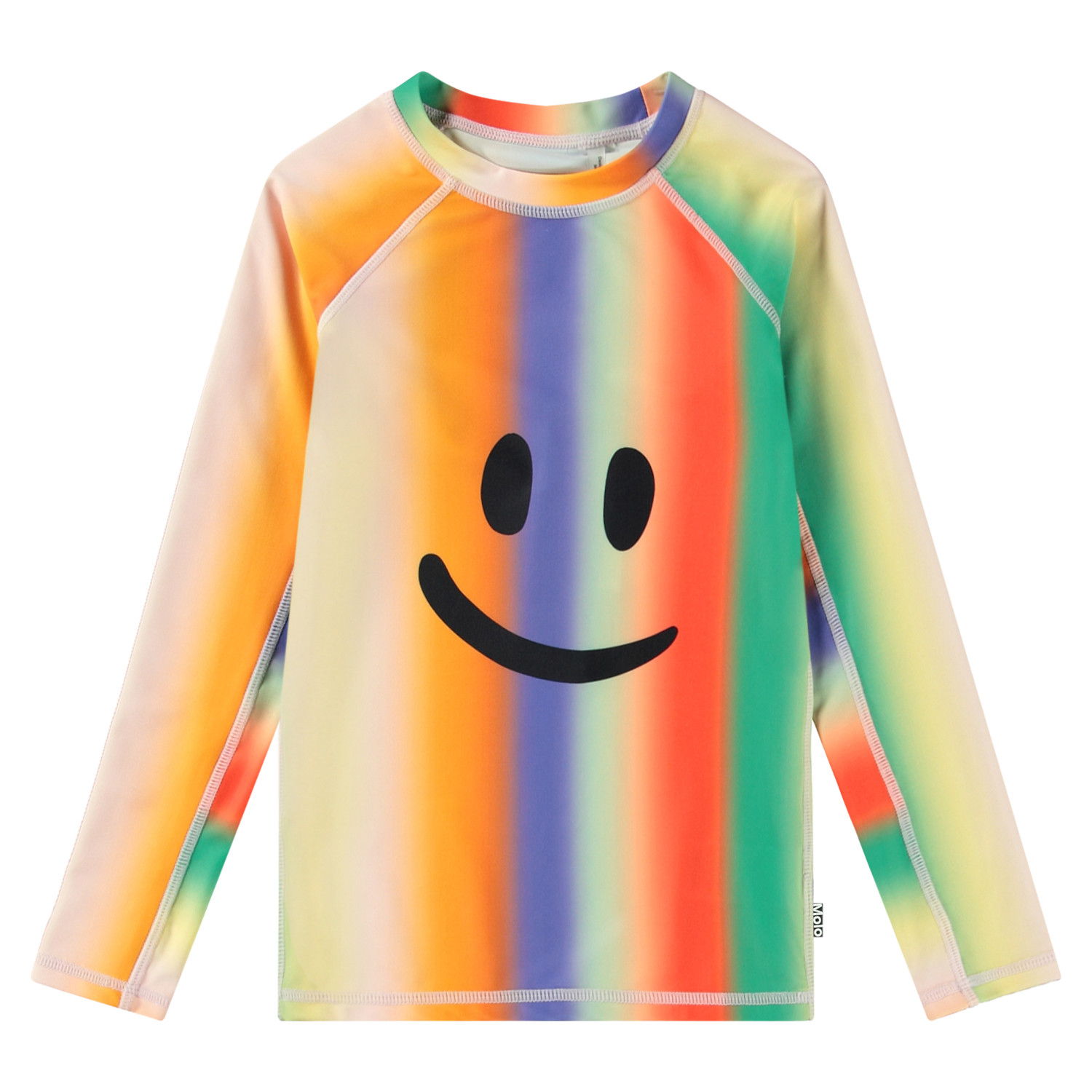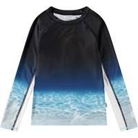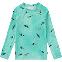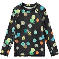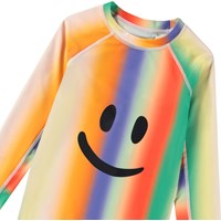 Badebluse til aktive børn fremstillet af genanvendt polyester med UV-beskyttelse 50+. Blusen har en tætsiddende pasform, opstående krave og lange raglanærmer. Den er behagelig at have på i det strækbare materiale. Blusen har et farverigt regnbueprint og et smilende ansigt på fronten. Produktet er CE-mærket og testet i henhold til standard: EN-13758-1.