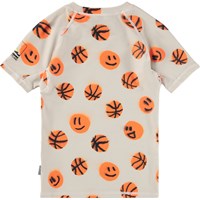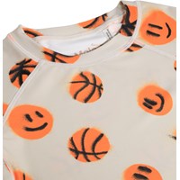 Badet-shirt i beige med orange basketprint til aktive børn. Fremstillet af genanvendt polyester med UV50+ beskyttelse. Har tætsiddende pasform, opretstående krave og korte raglanærmer. Det strækbare materiale giver høj komfort – perfekt til strand og pool.