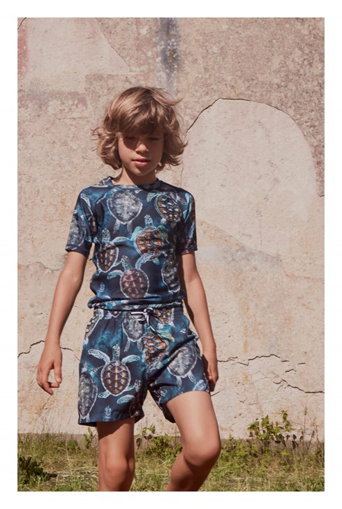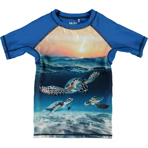 Neptune er en suveræn UV svømme t-shirt, som beskytter mod solens skadelige stråler. Her er t-shirten med blå ærmer og print af skildpadder under havets overflade og solnedgang for oven. T-shirten er tynd og rar at have på og har en god bevægelighed. Kombiner t-shirten med de matchende shorts for et cool surfer look. Molo's badetøj har UV beskyttelse 50+. Produktet er CE-mærket og testet i henhold til standard: EN-13758-1.